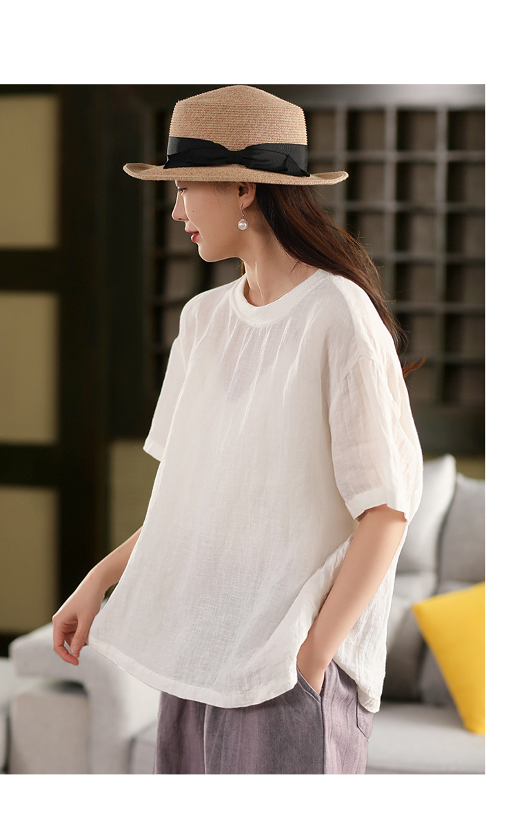 Linen Top Women Spliced Ribbed Round Neck Short Sleeve Casual Pullover T-Shirt